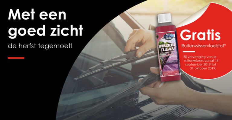 Ga langs bij ons en ontvang een gratis flesje ruitenwisservloeistof bij vervanging van je ruitenwissers. Actie geldig bij vervanging van je ruitenwissers 15 november 2019.
